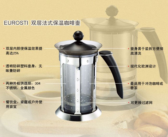 > 功能:现代化欧洲设计,法式保暖咖啡壶最适合冲泡咖啡或香茶,可以有效隔离咖啡粉及茶叶,可以便捷快速完成饮品的混合,时刻保持新香口味。双层内胆可保温更长时间。