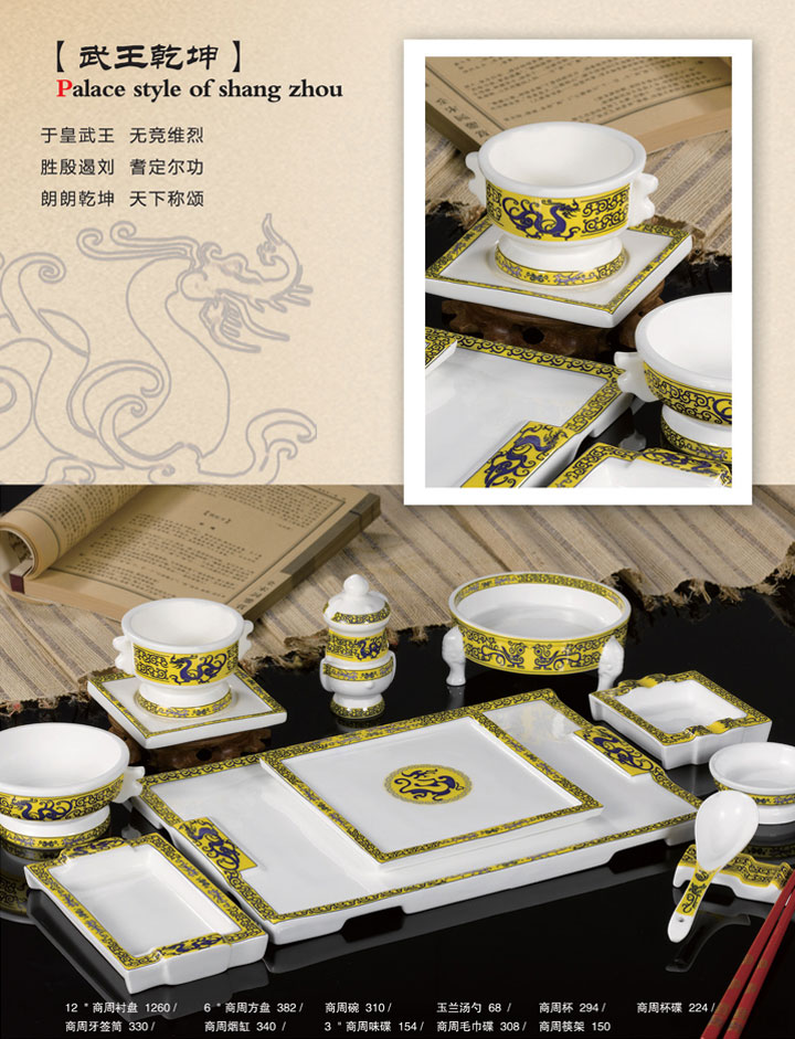12寸商周衬盘、6寸商周方盘、商周碗、玉兰汤勺、商周杯、商周杯碟、商周牙签筒、商周烟缸、3寸商周味碟、商周毛巾碟、商周筷架。