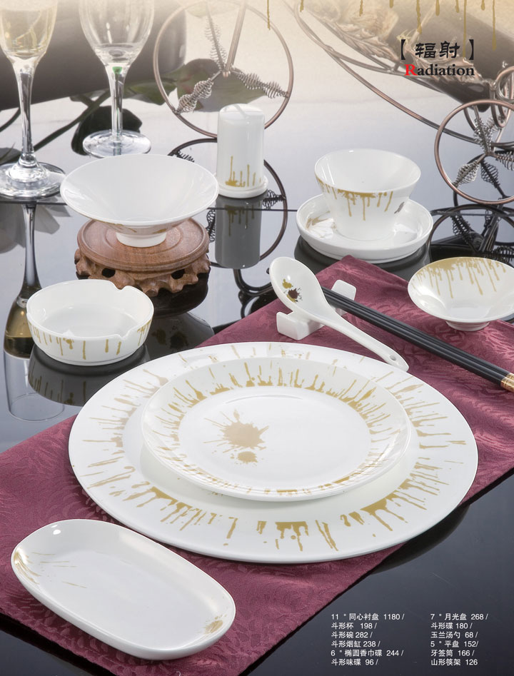 11寸同心衬盘、7寸月光盘、斗形杯、斗形碟、斗形碗、玉兰汤勺、斗形烟缸、5寸平盘、6寸椭圆香巾碟、牙签筒、斗形味碟、山形筷架。