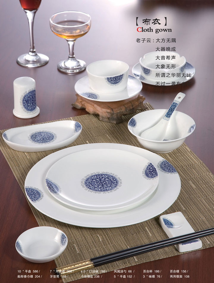 10寸平盘、7寸月光盘、4.5寸口汤碗、凤尾汤勺、百合杯、百合碟、船形香巾碟、牙签筒、斗形烟缸、5寸平盘、3寸味碟、两用筷架。